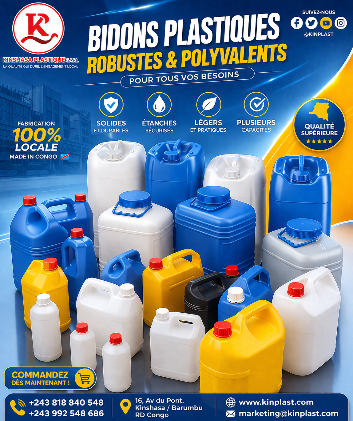 🔥 BIDONS PLASTIQUES HAUTE QUALITÉ DISPONIBLES ! Vous recherchez des bidons solides, fiables et durables ? 👉 Kinshasa Plastique vous propose des solutions adaptées à tous vos besoins. ✅ Résistants et sécurisés ✅ Plusieurs capacités disponibles ✅ Idéal pour eau, produits chimiques, huile et plus 🇨🇩 Fabrication 100% locale...